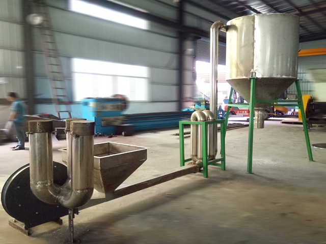 此款烘干机为硬质塑料回收清洗处理的最后一个环节,通过吹热风的风机将物料经过干燥管道送入到料斗中。机体为全不锈钢制造,主要用来处理各种硬质塑料破碎片料,塑料清洗脱水后烘干减少水份, PET瓶片热风机 烘干机目前市场上是各种塑料清洗脱水机快速烘干设备。本机结合了热风烘干机、气流分选机二者的功能于一体,烘干部分采用U型曲折管,让物料在气流输送过程中得到了充分的翻滚,使烘干效果更明显且干燥度十分均匀;水分控制在1-1.4%以内(此参数用温度计无法直接测出,我公司采用电子天平进行烘烤量差法测试得出的精确数据)。